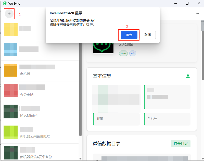登陆后点左上角 + 号,扫描完成后输入会话名称与微信昵称后点“确认添加”;