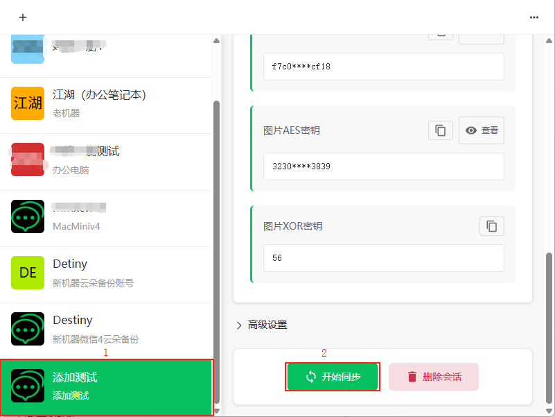 自动同步:会话详情中展开“高级设置”,开启自动同步开关,当微信数据目录下的文件变化时会自动同步,同步的文件会自动解析