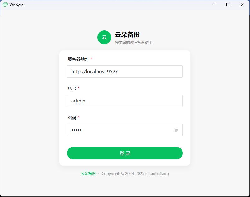 打开WeSync,输入云朵备份服务端地址,用户名和密码点击登录